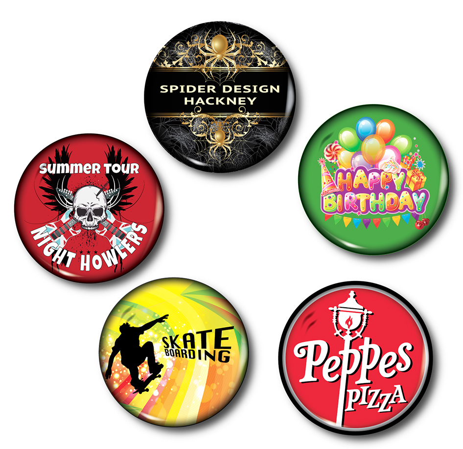 38mm Metal Button Badges with secure safety pin or clip fastening, ideal for young children. Price includes printing in as many colours as you wish.